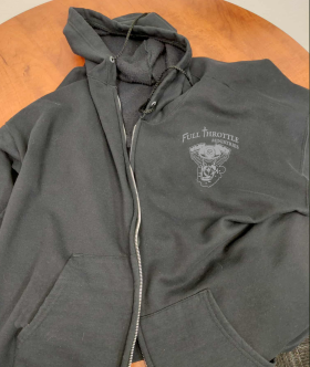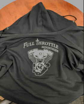 FULL THROTTLE MINISTRIES OF NEW MEXICO BLACK FULL ZIPPER HOODIE. Has the Large logo on the back and small 3.5" tall logo on the left front chest. Full Throttle Ministries Logo is Silver Heat Transfer Vinyl.